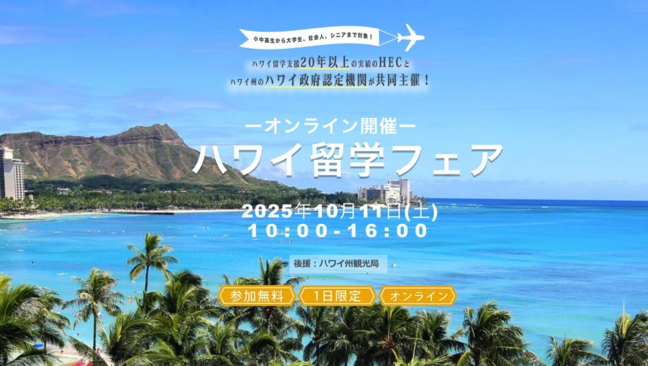 2025年10月11日(土)10時より開催します、「ハワイ留学フェア 2025」の特設サイトがオープンしましたので、特設サイトのお披露目を兼ねてイベントの注目ポイントをご紹介します!